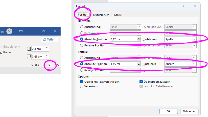 Größe einstellen (Höhe 0 cm Breite: 1cm )