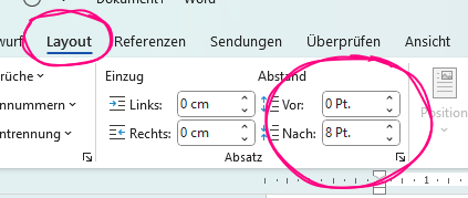 Diese Abstände werden jedem Absatz zugewiesen. Durch einen Abstand VOR dem Absatz, rutscht der entsprechende Textblock so weit nach unten, dass ein Bereich in der angegebenen Größe oberhalb des Absatzes leer bleibt. Der Abstand kann aber auch NACH dem Absatz eingefügt werden. Dann entsteht die Lücke unterhalb des Absatzes.
